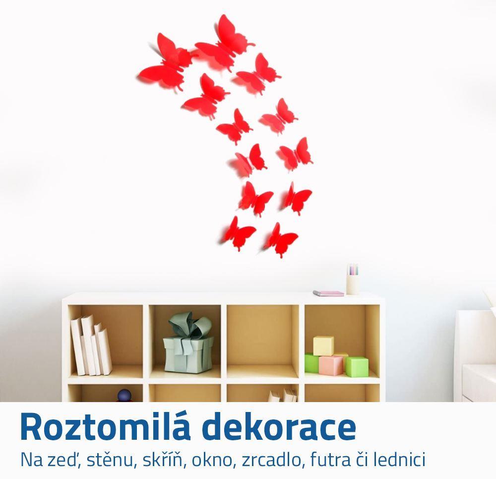 Originální dekorace do interiéru! 3D motýli, které lze umístit na stěnu, zeď, okno, zrcadlo, skříň nebo také na lednici. 3D motýli mají dva způsoby upevnění. Buď pomocí oboustranné lepicí pásky, která je obsahem balení nebo magnetem.Menší magnet je umístěný na těle motýla. V balení je celkem 12 motýlů. Jejich velikost je různá. Křídla jsou ohebná, pokud je lehce vytvarujete, působí poté motýlci realističtějším dojmem.