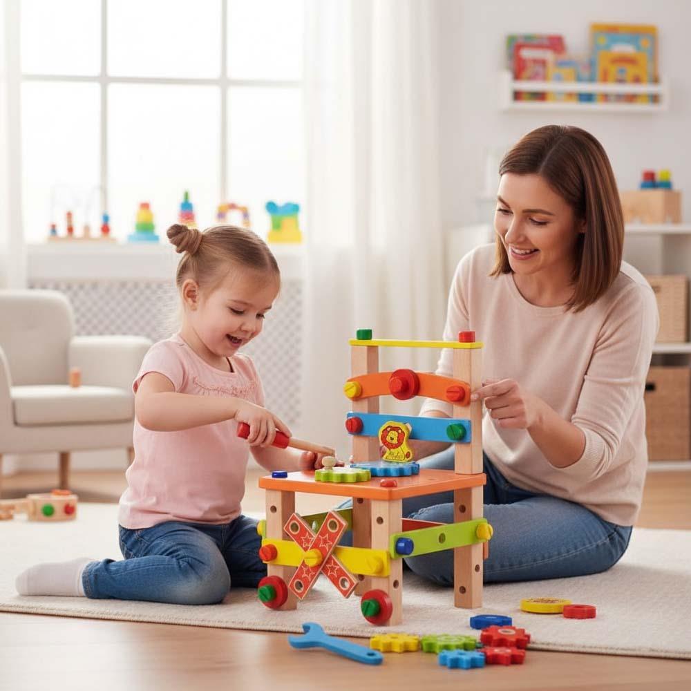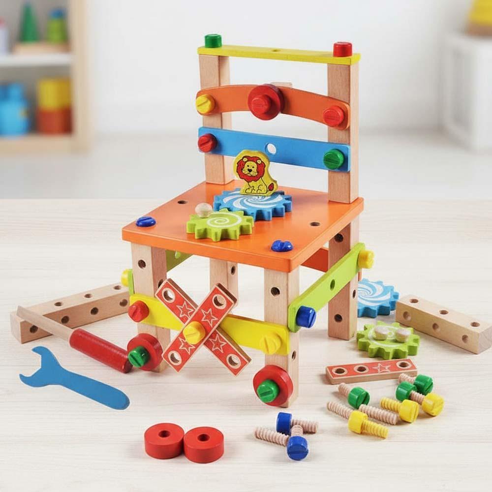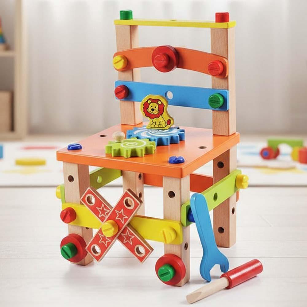 Dřevěné hračky jsou oblíbené, protože šetří naše životní prostředí. Vzdělávací dřevěná židlička toho ale skrývá mnohem více než jen materiál. Výborně totiž podporuje děti v jejich kreativitě a manuální zručnosti. Mohou si samy poskládat a sešroubovat svoji židličku. Ze židličky lze však sestavit i jiné tvary a hračky. K tomu jim pomůže dřevěný šroubovák a klíč. Dřevěná židlička toho má zkrátka hodně co nabídnout. Vzdělávací a interaktivní hračka rozvíjí motorické a poznávací schopnosti. A to vše individuálně či při skupinovém tvoření.