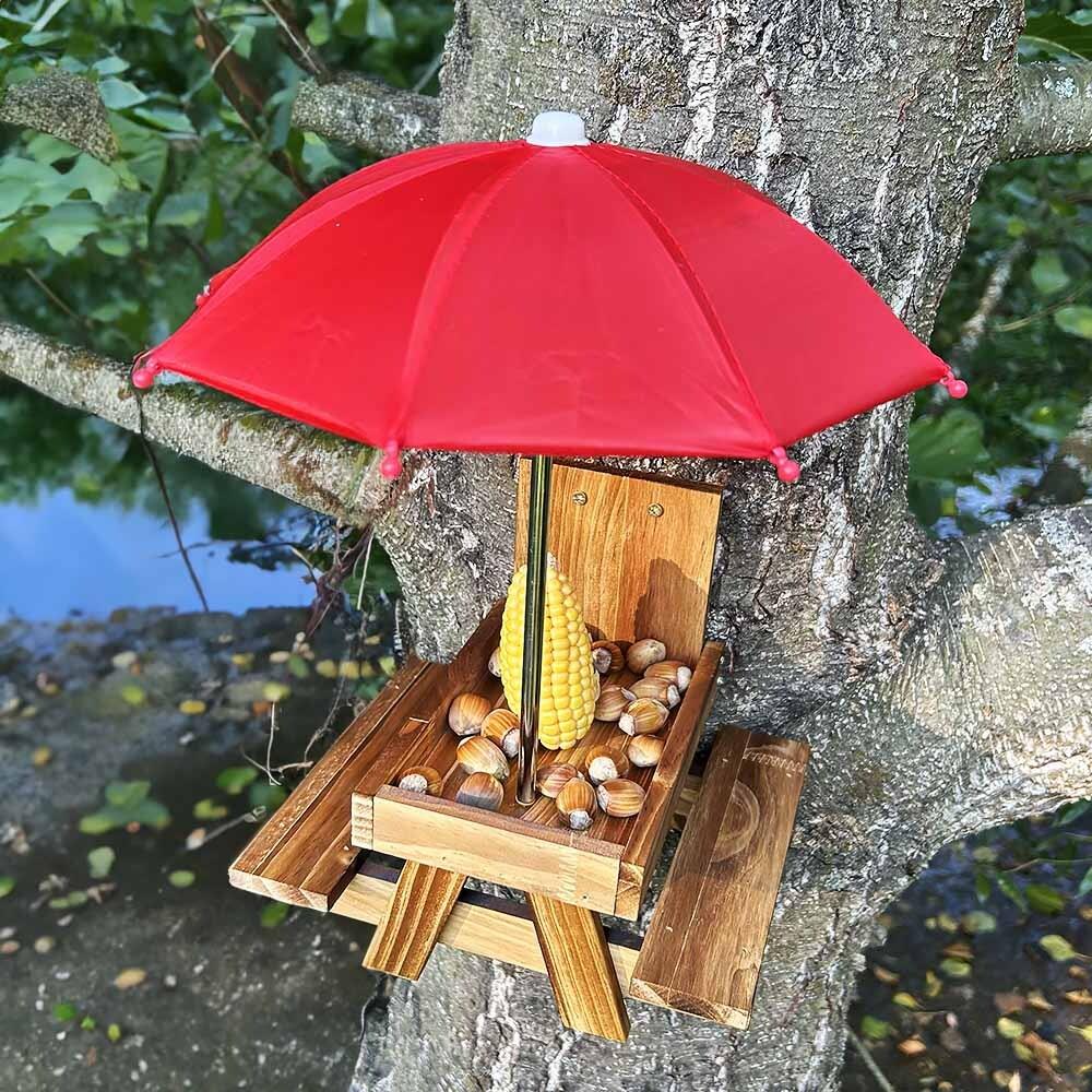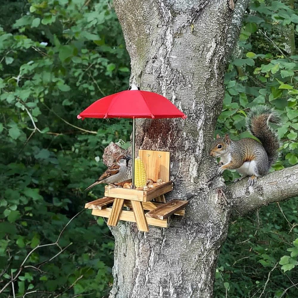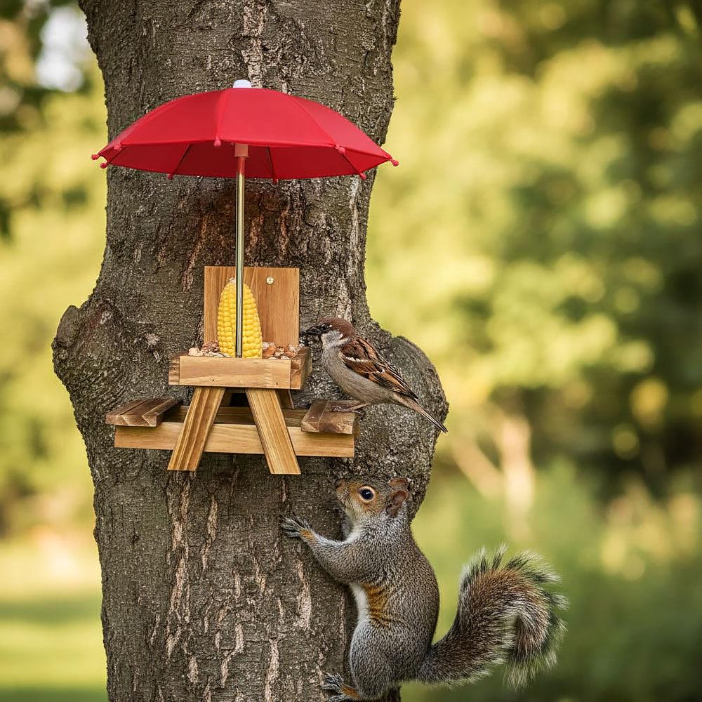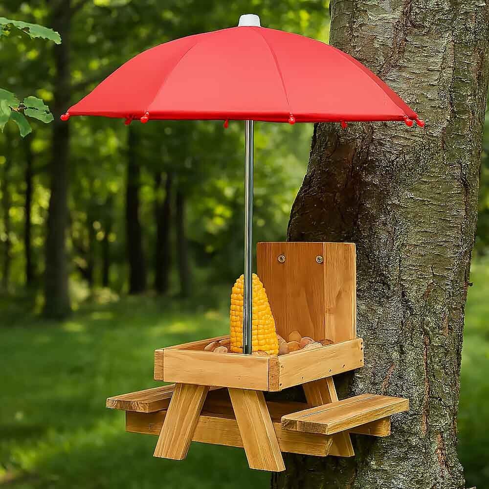 Přineste do své zahrady nebo na balkon radost s tímto unikátním krmítkem ve tvaru piknikového stolu! Nejenže přiláká opeřené návštěvníky a další malé tvory, ale také vám nabídne jedinečnou podívanou na jejich rozvernou hostinu. Praktický deštník chrání pamlsky před deštěm i přímým sluncem.