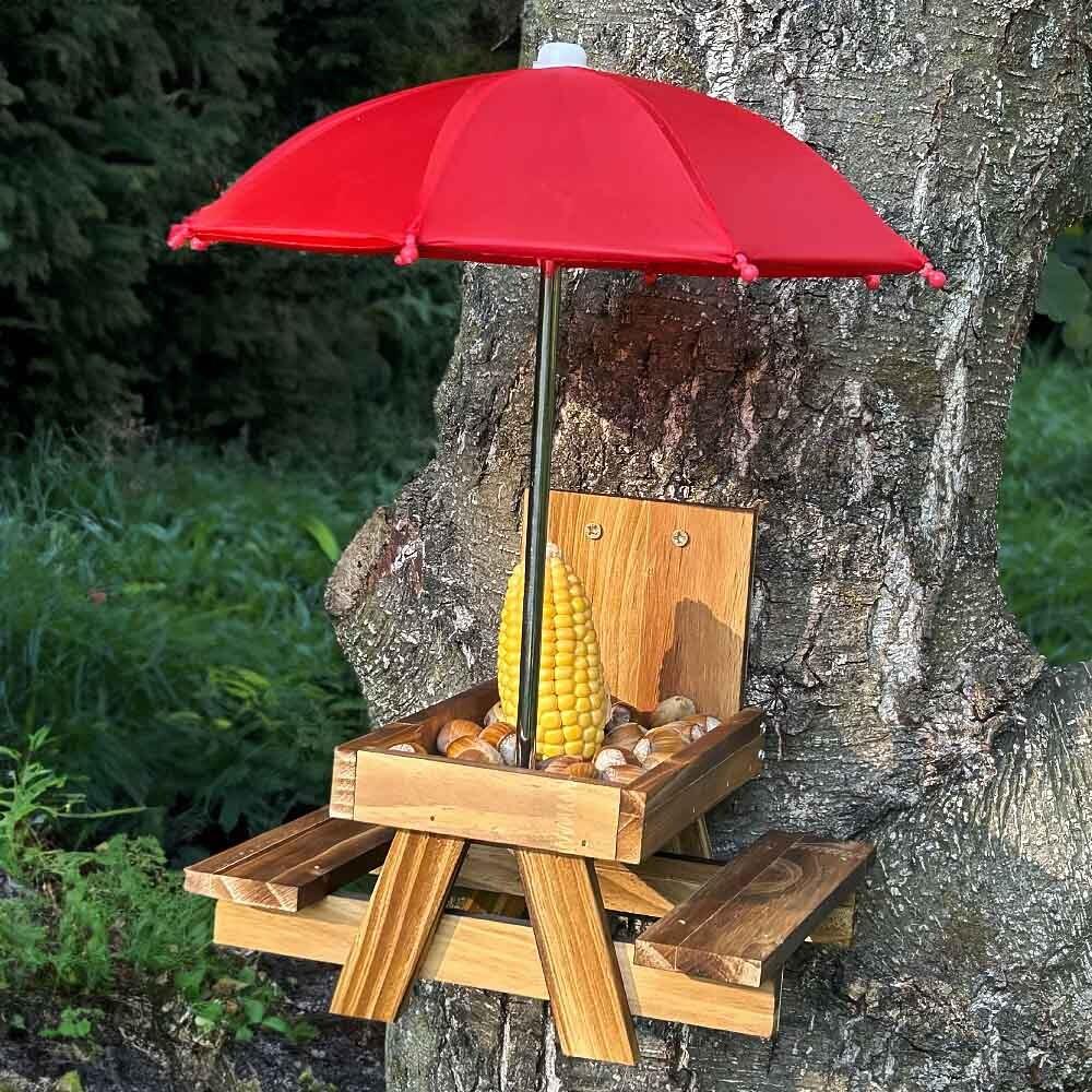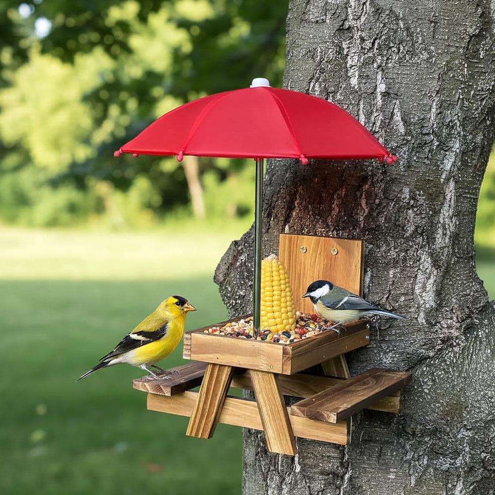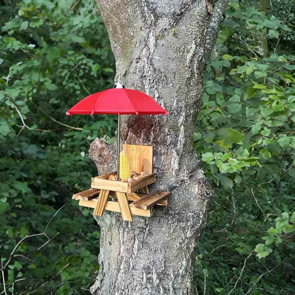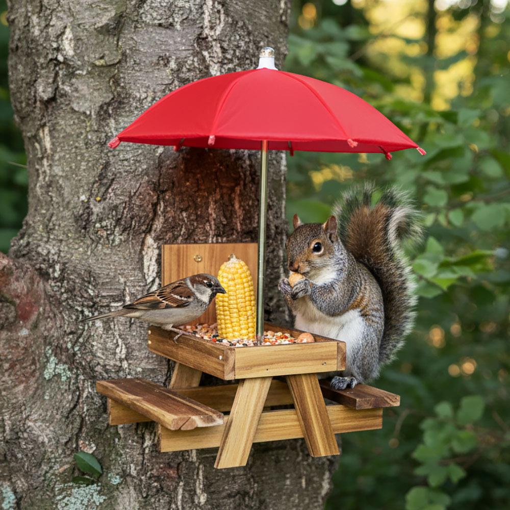 Přineste do své zahrady nebo na balkon radost s tímto unikátním krmítkem ve tvaru piknikového stolu! Nejenže přiláká opeřené návštěvníky a další malé tvory, ale také vám nabídne jedinečnou podívanou na jejich rozvernou hostinu. Praktický deštník chrání pamlsky před deštěm i přímým sluncem.