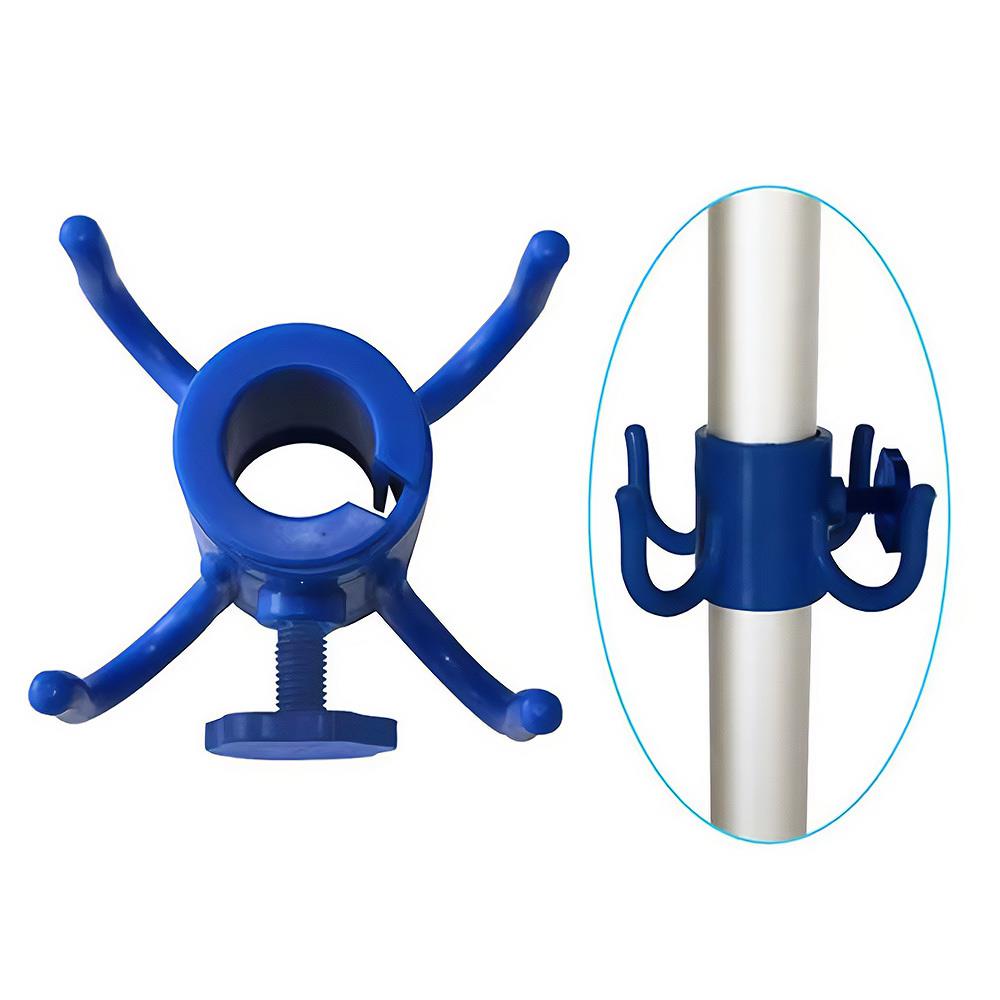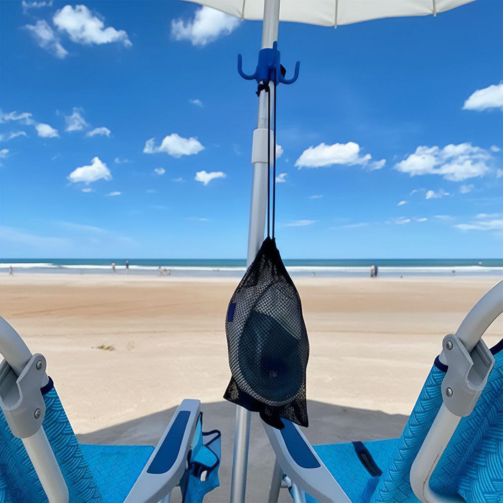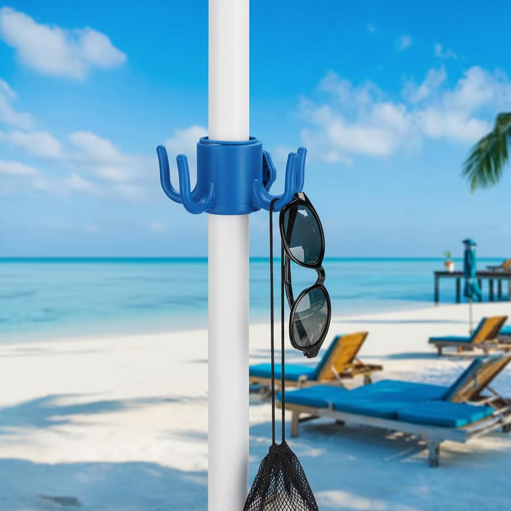 Praktický držák se 4 háčky se nasadí na tyč slunečníku a udrží vaše věci čisté a přehledně po ruce. Skvělý pomocník na pláž, k bazénu i na zahradu.