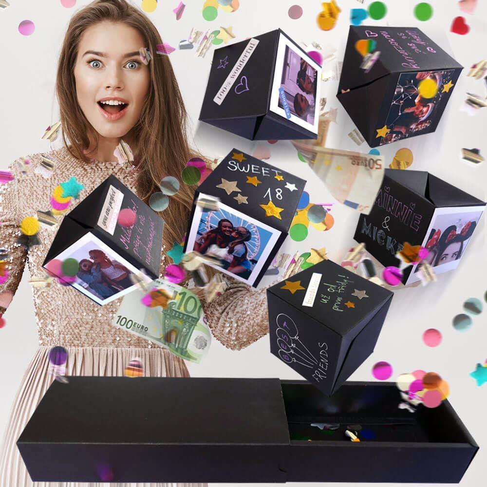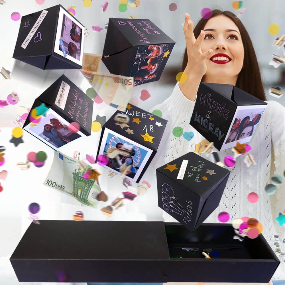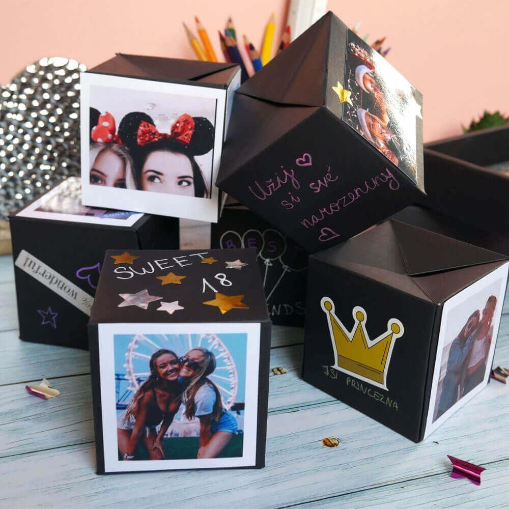 Hledáte způsob, jak udělat dárek opravdu nezapomenutelným? Tato originální explodující krabička promění obyčejný dárek v okamžik plný překvapení a radosti. Po otevření se z velké krabičky vysune několik menších krychlí, které můžete individuálně ozdobit – fotografie, vzkazy, samolepky nebo malované motivy udělají z každé krychle malý osobní poklad.