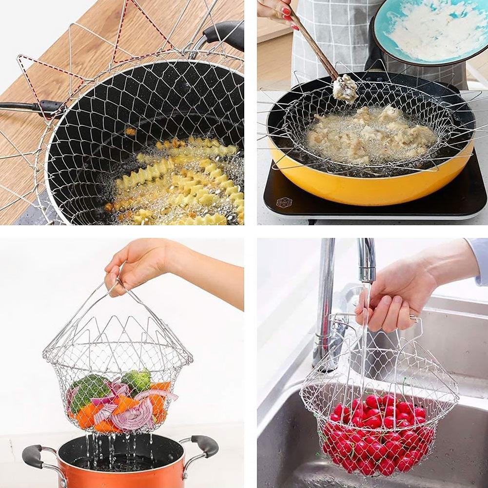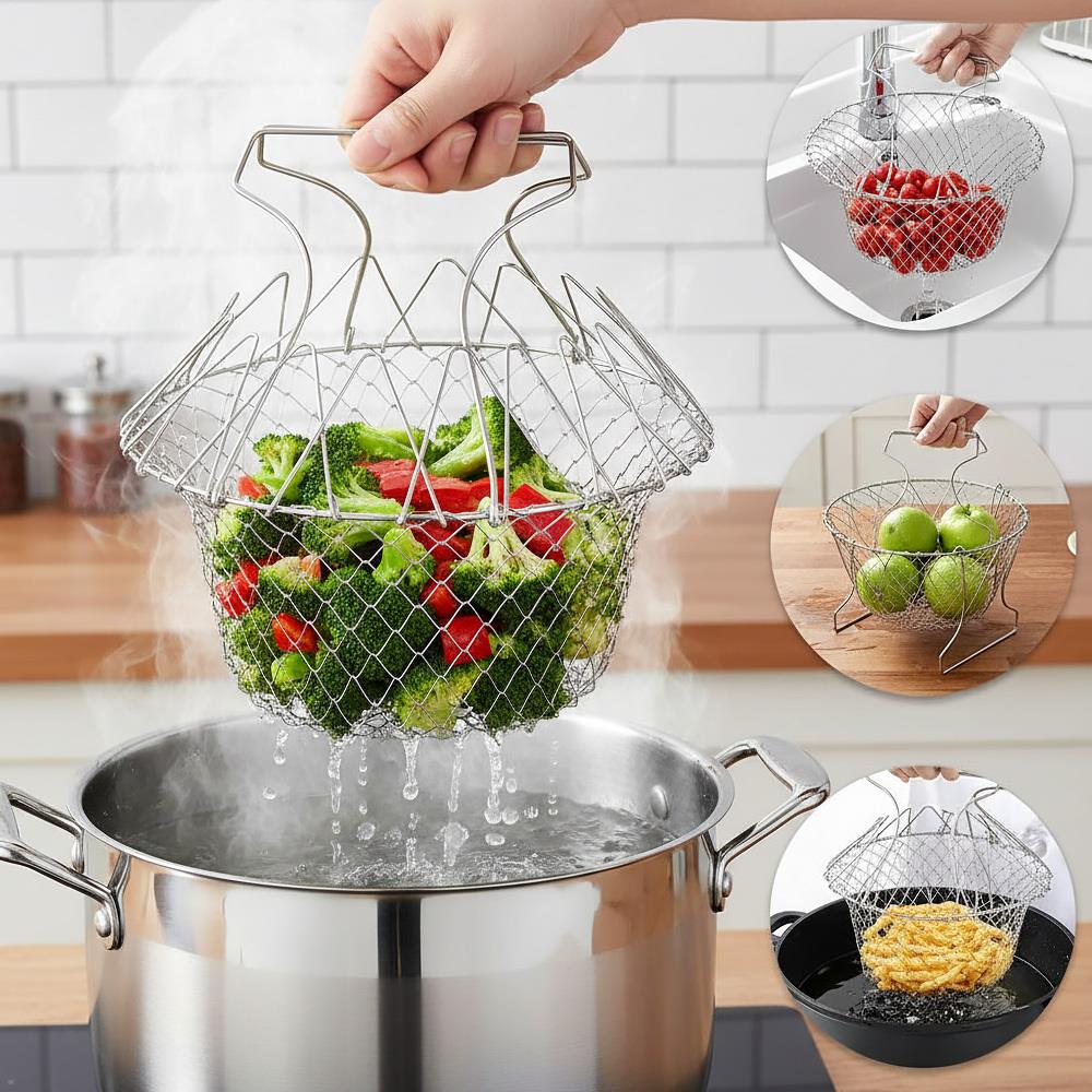 Objevte univerzální kuchařský košík, který ocení každý – od profesionálních kuchařů až po domácí nadšence! S tímto multifunkčním pomocníkem zvládnete přípravu jídel rychleji a efektivněji. Skvěle poslouží jako pařáček pro vaření na páře, cedník na oplachování těstovin i zeleniny, ale využijete ho i jako praktickou mísu na ovoce či další suroviny. Košík je vyrobený z odolné nerezové oceli, snadno se skládá a rozkládá a ve složeném stavu zabere minimum místa. Stane se vaším nepostradatelným parťákem při vaření – ať už potřebujete vařit, smažit nebo omývat suroviny. Tip: Při přípravě těstovin vás už nikdy nepřekvapí, že máte málo uvařených – vařte je v sítu přímo ve vroucí vodě. Pokud potřebujete přidělat další porci, v hrnci vám zůstane horká voda připravená k okamžitému použití. Ušetříte čas i energii!
