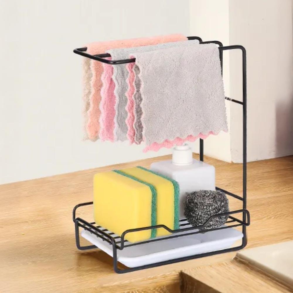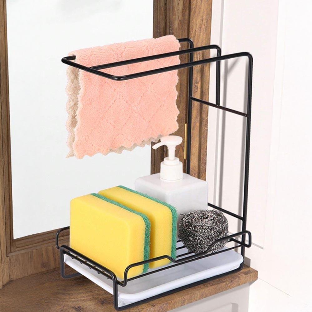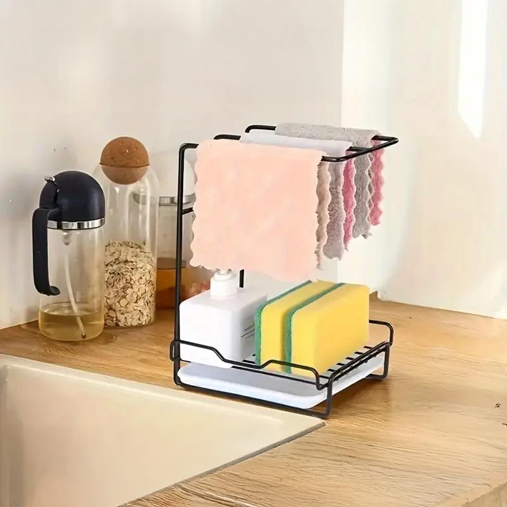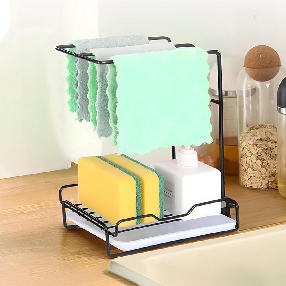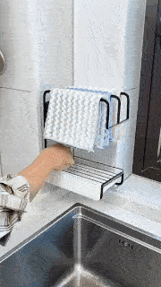 Praktický organizér na houbičky, utěrky i kartáčky s odkapávacím táckem. Lze postavit na linku nebo zavěsit pomocí samolepicích háčků. Udržte kuchyň čistou a přehlednou!