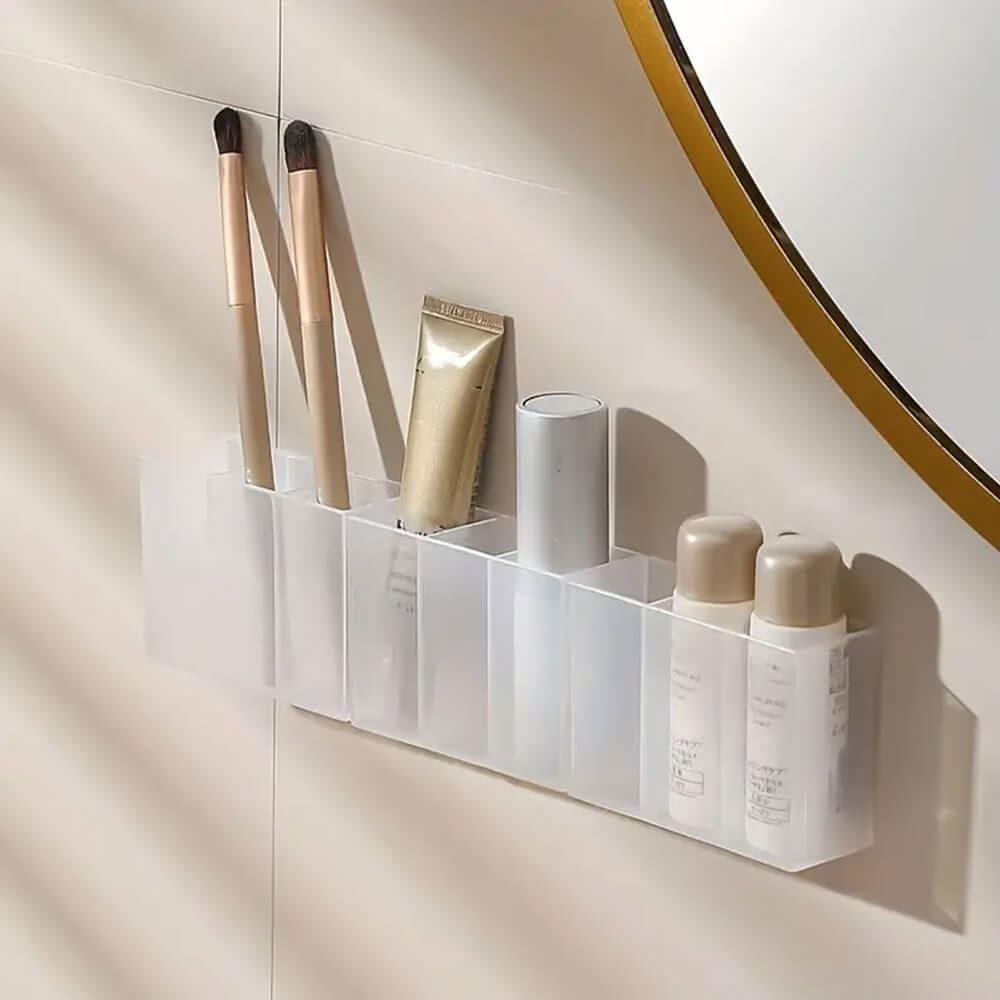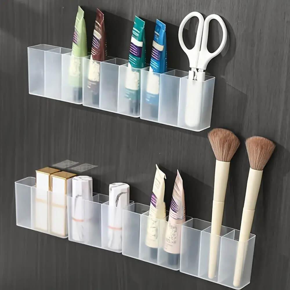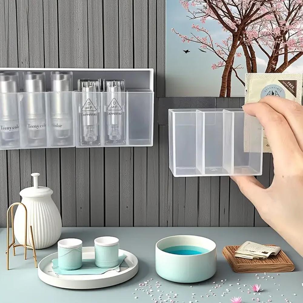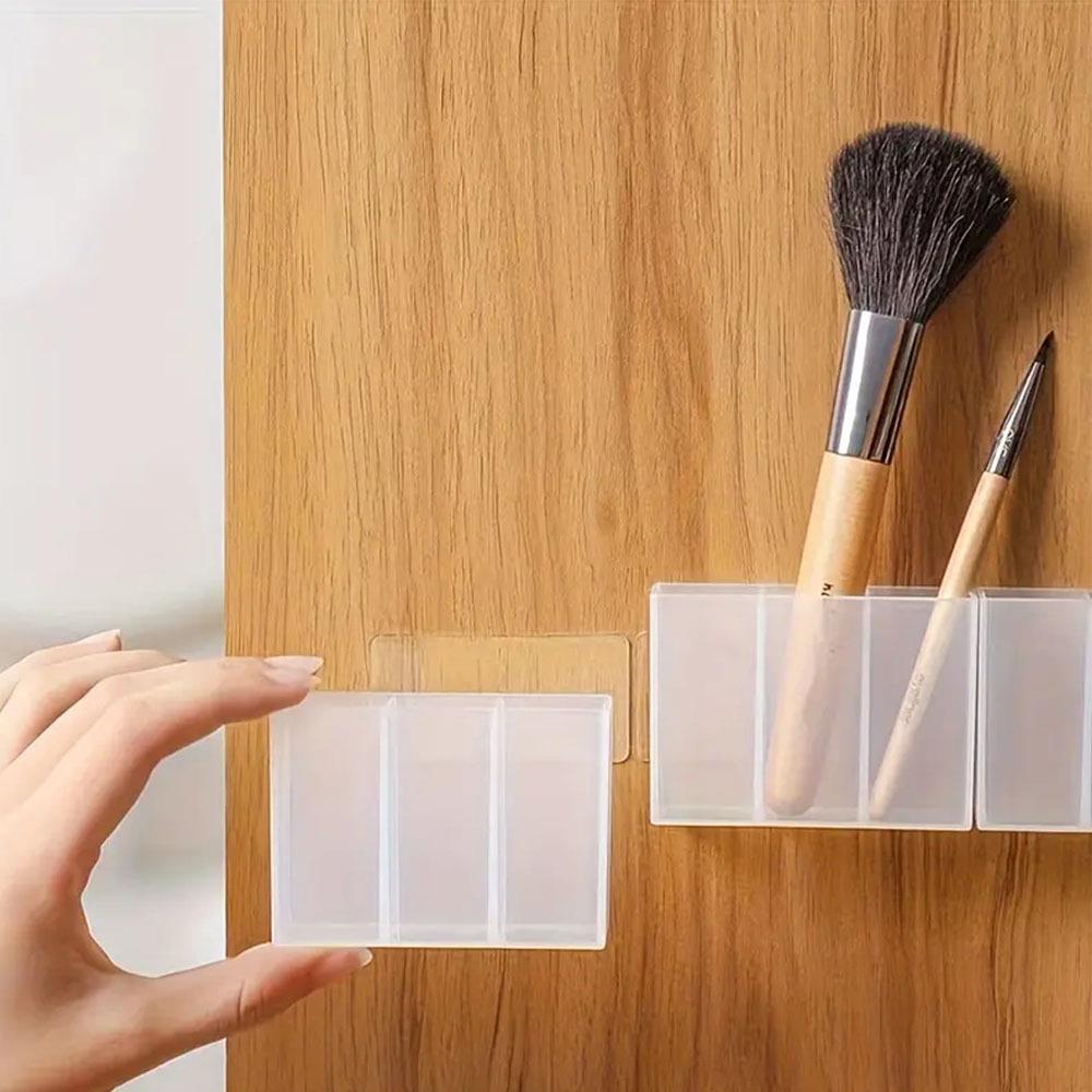 Průhledné nalepovací přihrádky potěší zejména ženy. Průhledná trojpřihrádka pomůže k perfektní organizaci drobné kosmetiky či kosmetických potřeb v koupelně. Ať už do ní uložíte rtěnky, štětce, pinzety či vatové tyčinky, poslouží k praktickému uspořádání věcí. Organizér lze nalepit pomoc oboustranných pásek na dlaždice či stěnu. Můžete ho nalepit i dveře skříňky dovnitř i zvenčí. Kosmetické potřeby budete mít vždy po ruce a hezky uspořádané. Transparentní design je jednoduchý a praktický. Lze pořídit více trojpřihrádek a nalepit je vedle sebe. Vznikne vám prostornější a delší organizér!