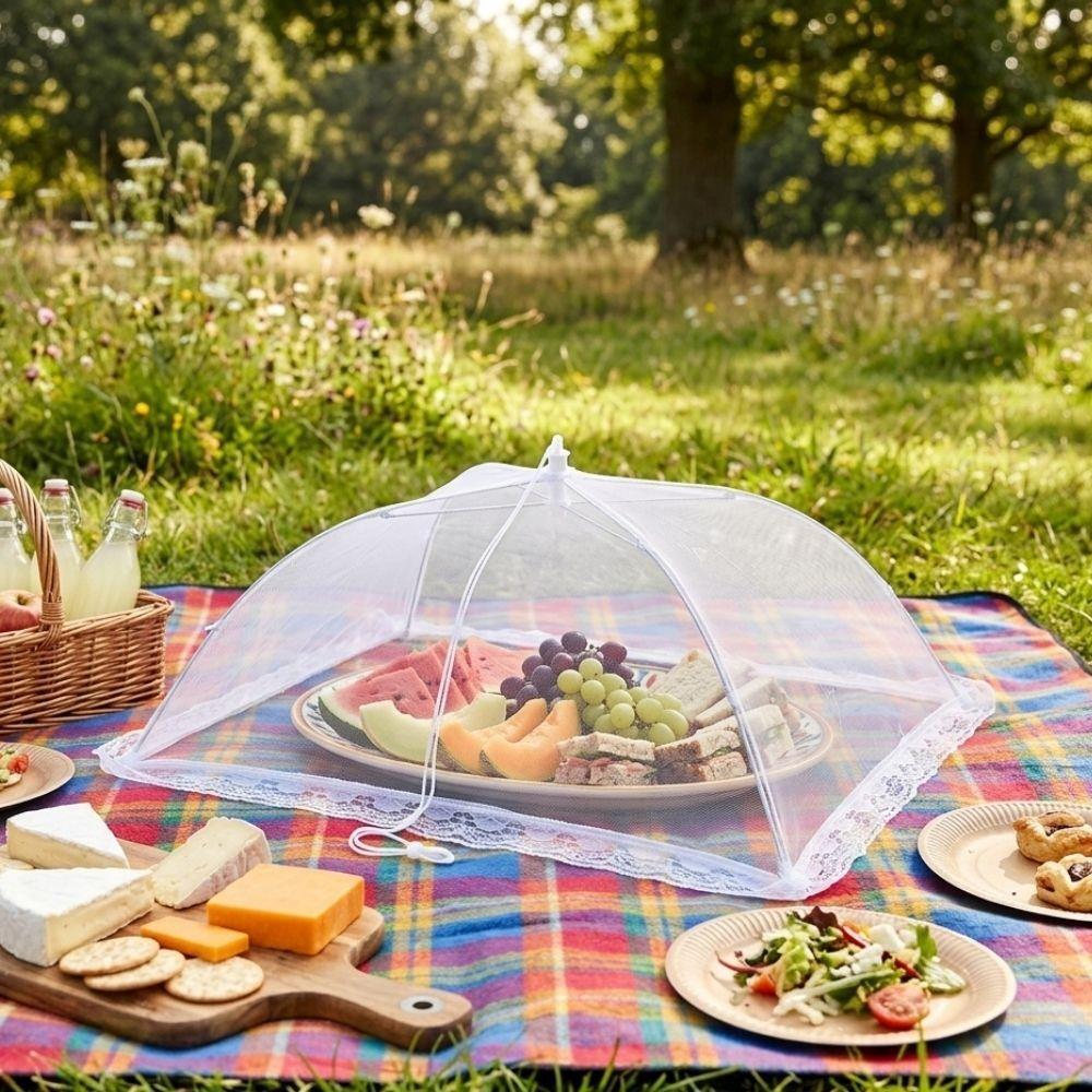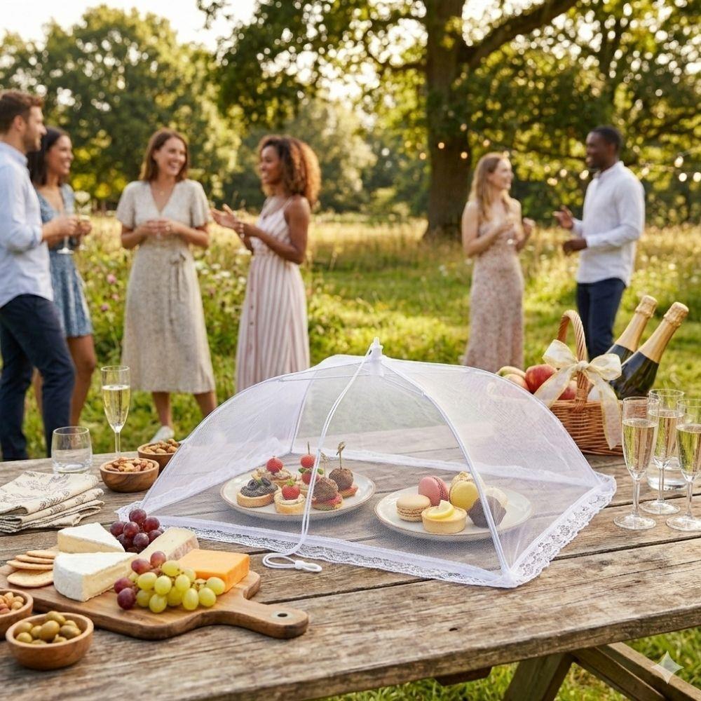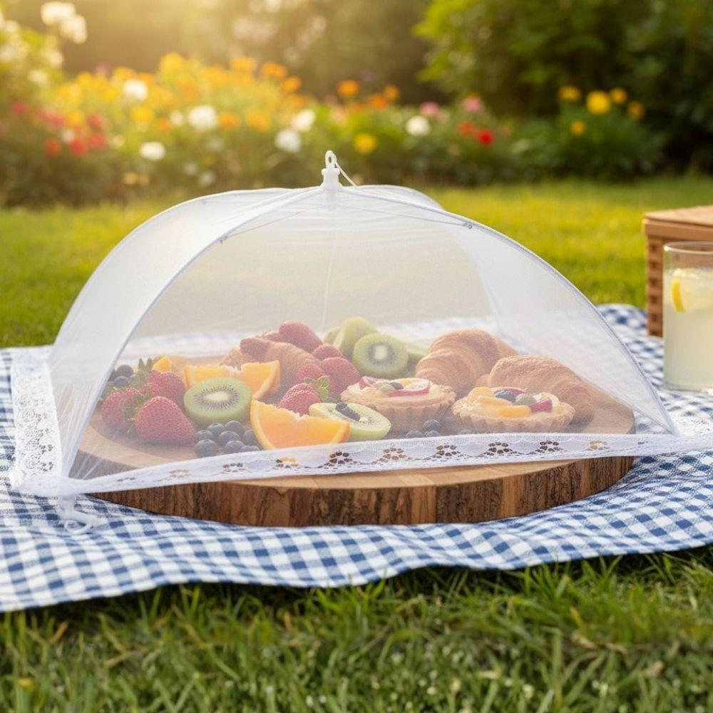 Ochranná síťka na potraviny je nepostradatelný společník při stolování pod širým nebem. Účinně chrání pokrmy před mouchami, vosami a dalšími nečistotami, zatímco jemná síťovina umožňuje snadnou kontrolu obsahu. Síťku stačí jednoduše rozložit a bezpečně přikrýt jídlo.