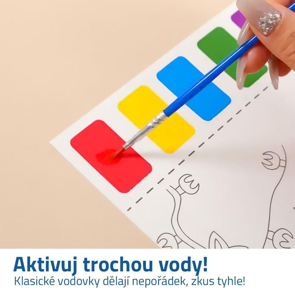 Omalovánky s vodovými barvami zábavně rozvíjí kreativitu i jemnou motoriku. Stačí štětec a kapka vody – barvy jsou součástí stránek.