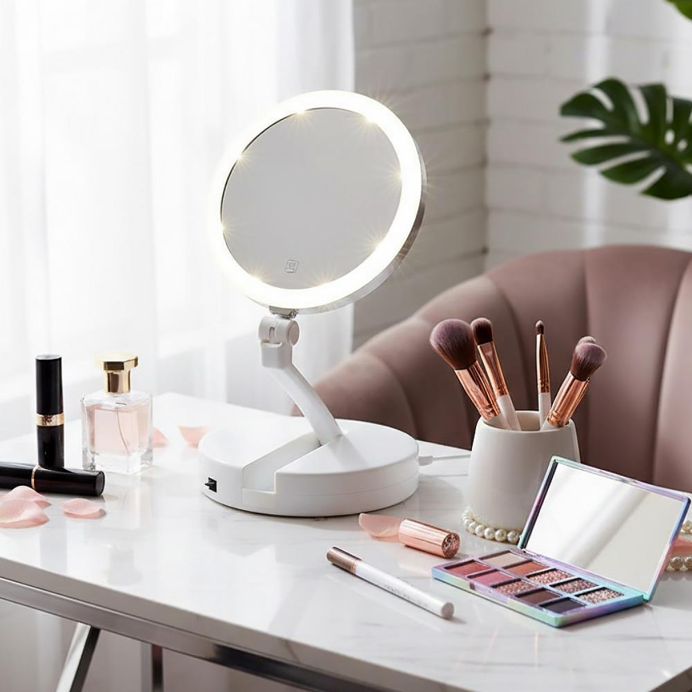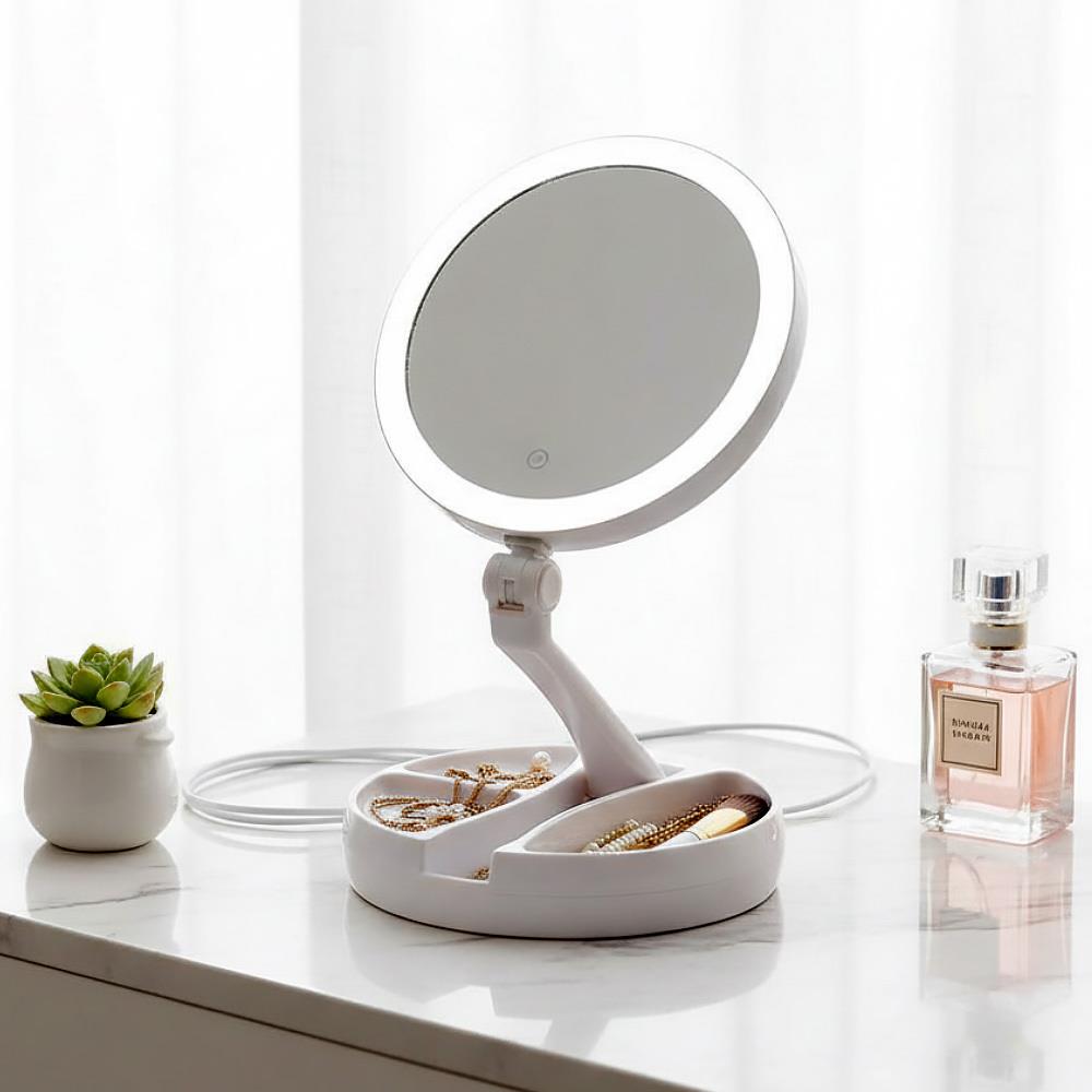 Šikovné podsvícené zrcátko je nezbytným doplňkem pro každou ženu. Zrcátko má jednu klasickou reflexní plochu a druhou plochu s desetinásobným zvětšením. Díky otočné nožce si můžete zrcátko nastavit přesně podle vašich potřeb.