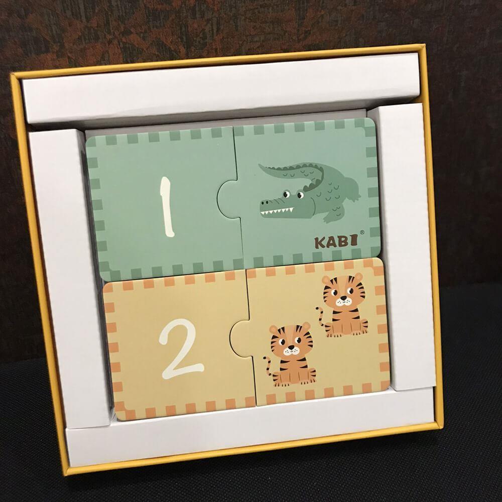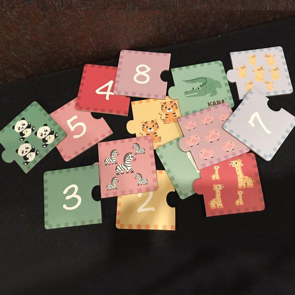 Jednoduché puzzle s velkými díly. Jeden díl na sobě má číslici, druhý díl má daný počet zvířátek. Zábava, při které se děti můžou snadno naučit počítat, znát číslice a názvy zvířátek.