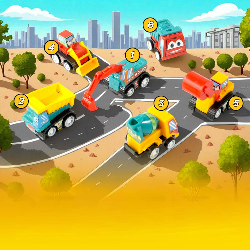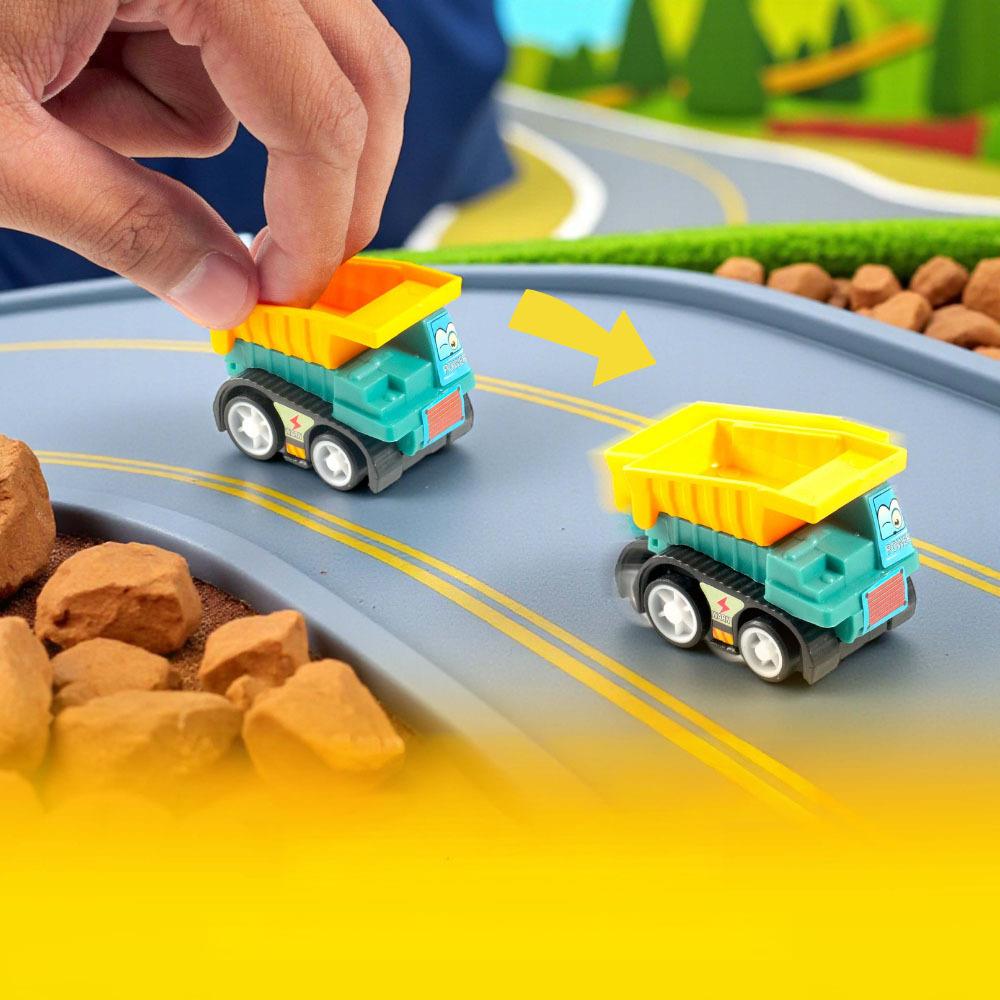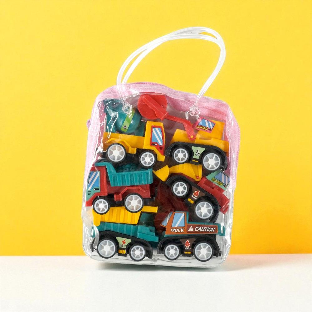Barevná sada 6 natahovacích stavebních autíček se sama pohybuje bez baterií. Uložena v praktické taštičce se zipem, je ideální na hraní doma i na cestách.