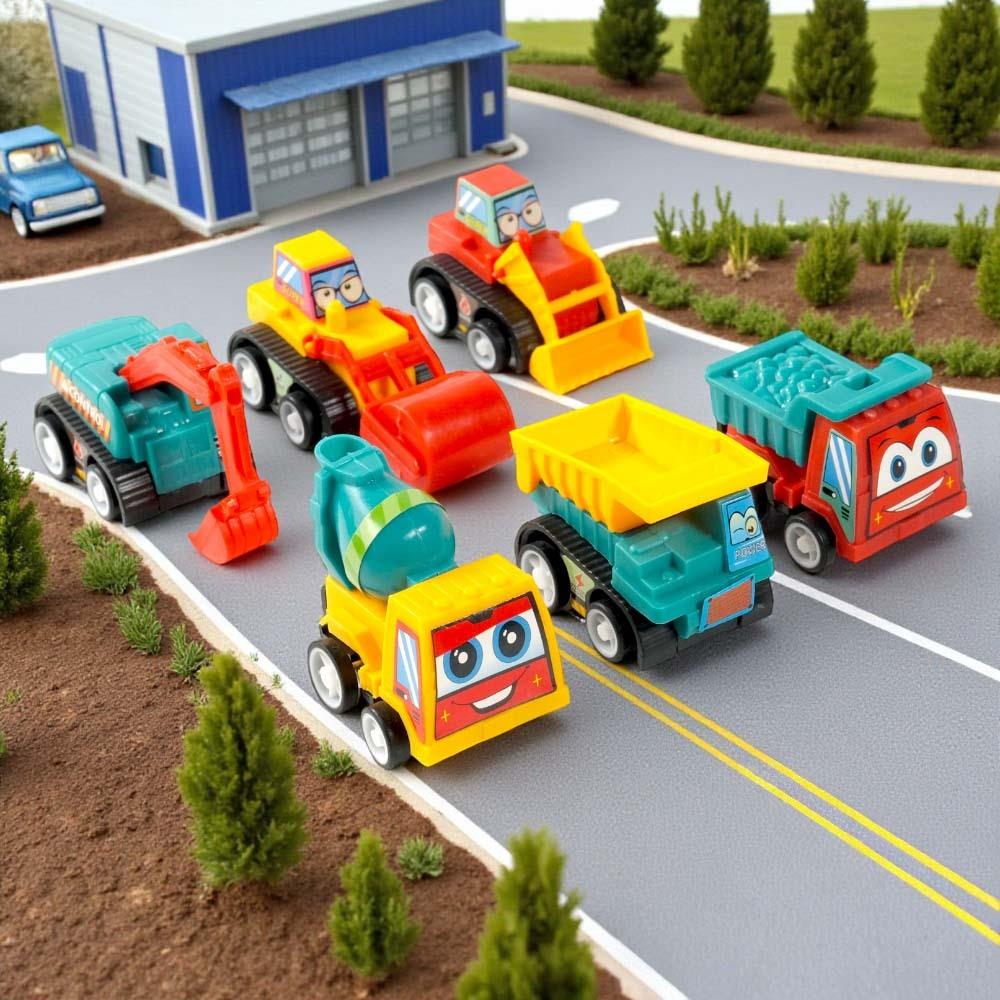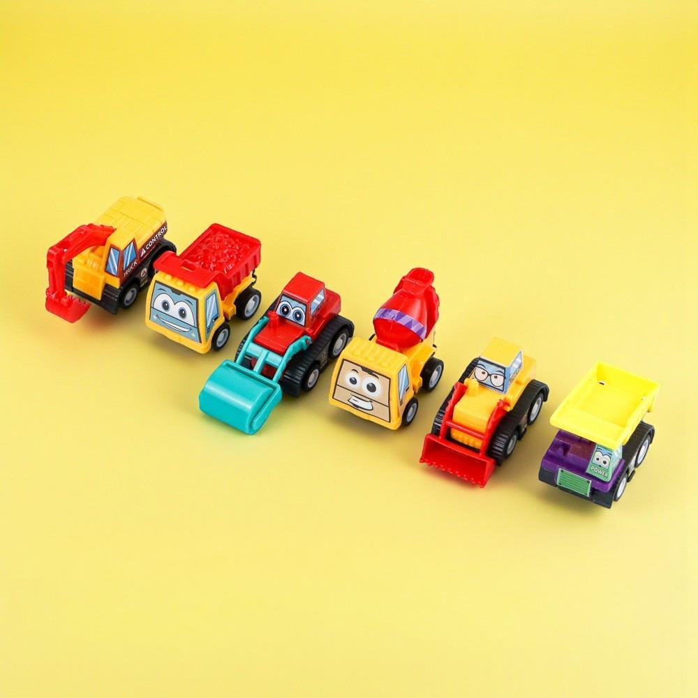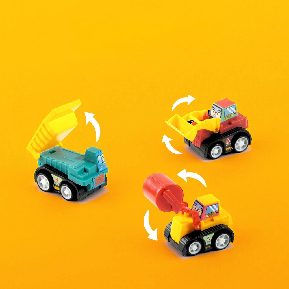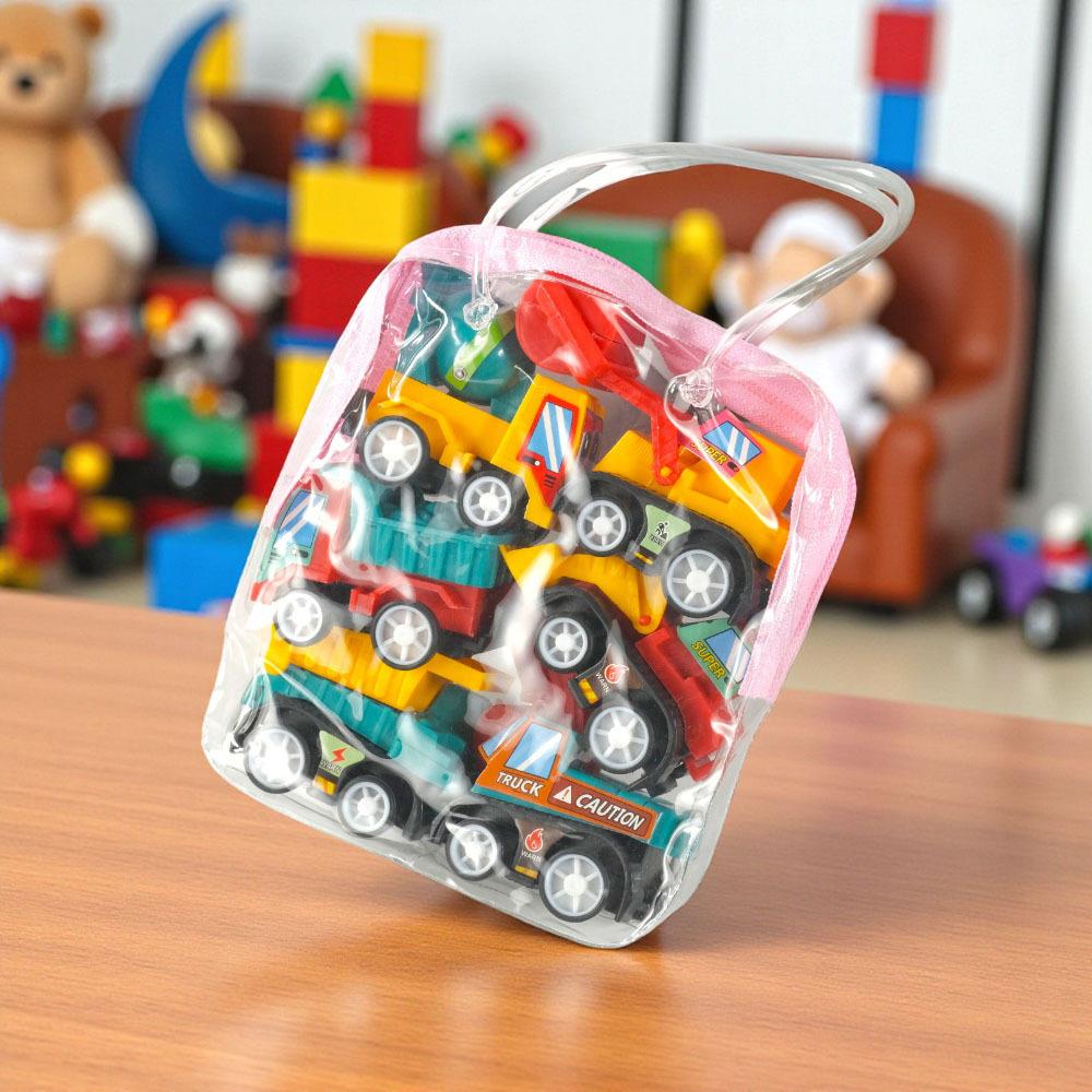 Barevná sada 6 natahovacích stavebních autíček se sama pohybuje bez baterií. Uložena v praktické taštičce se zipem, je ideální na hraní doma i na cestách.