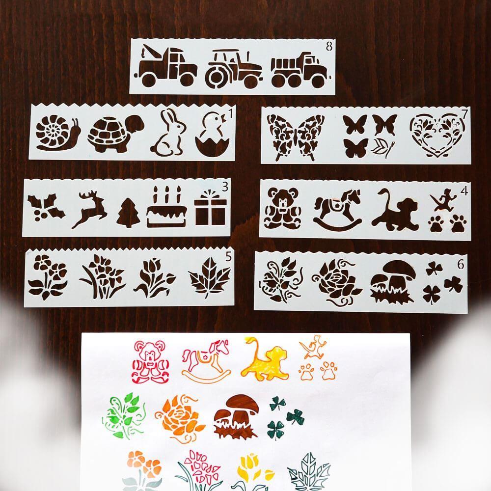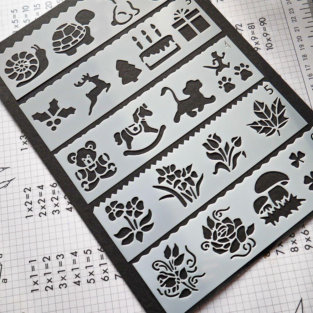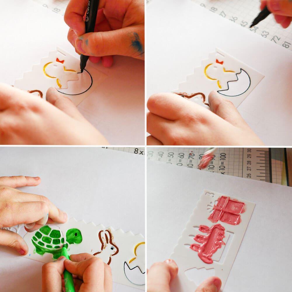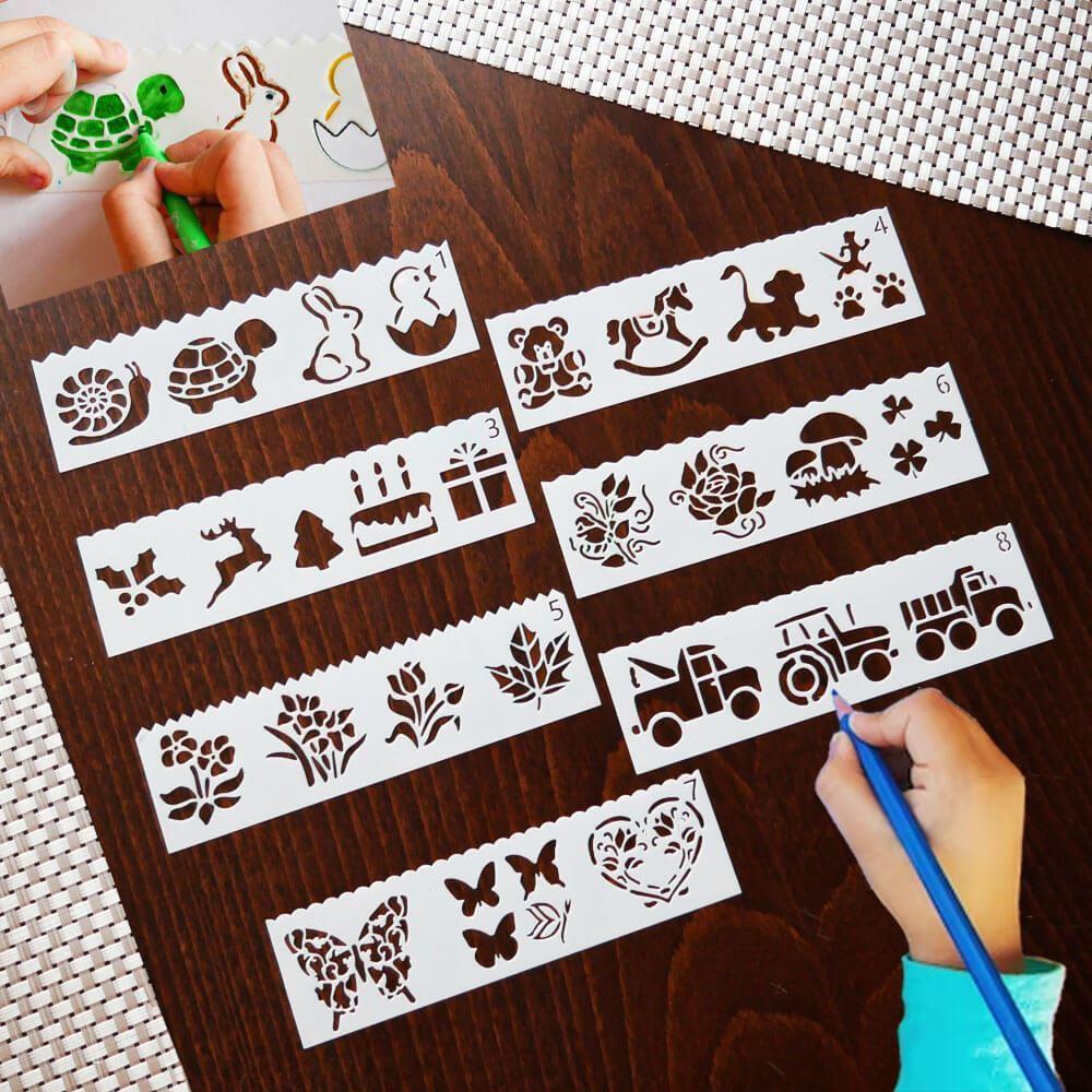 Šablony s různými předlohami nadchnou dětskou kreativitu. Použití je jednoduché - vyberte si jednu ze šablon, která se vám líbí, přiložte ji na papír a tupováním, fixami nebo štětcem s barvou přejeďte přes vzor a po odebrání šablony vyjde perfektní obrázkový vzor.