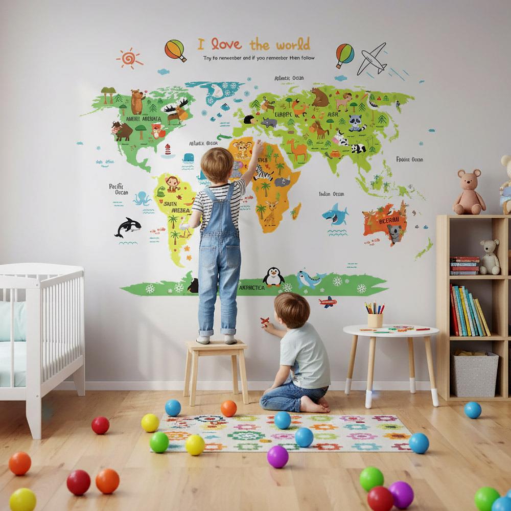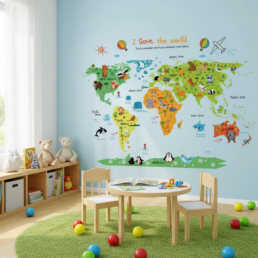 Hledáte veselou dekoraci do dětského pokoje? Tato mapa světa je jasná volba. Děti se díky ní naučí něco nového o kontinentech. Sami zjistí, jaká zvířata kde žijí, nebo kde je jaký oceán.