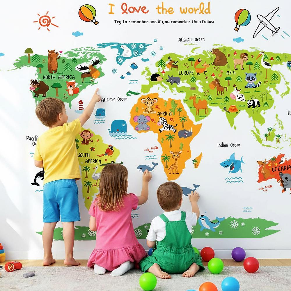 Hledáte veselou dekoraci do dětského pokoje? Tato mapa světa je jasná volba. Děti se díky ní naučí něco nového o kontinentech. Sami zjistí, jaká zvířata kde žijí, nebo kde je jaký oceán.Sejměte samolepky z archu v pořadí, ve kterém jsou očíslované. Odlepujte samolepky z archu opatrně, aby nedošlo k jejich poškození. Barvičky mapy se budou hodit do každého interiéru.