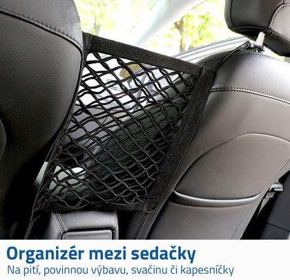 Univerzální síť jednoduše aplikujete mezi přední sedadla. Upevníte ji pomocí plastových háčků za tyčky opěrek a konstrukci sedadel. Síť lze upevnit také na zadní sedadlo. Plní funkci úložného prostoru na drobnosti: láhve, povinnou výbavu či kapesníčky. Síť ale lze i použít jako zátarasu pro pejsky, aby vám nepřekáželi při řízení. Zajistíte si tak bezpečnou a plynulou jízdu bez nehod a rozptýlení.