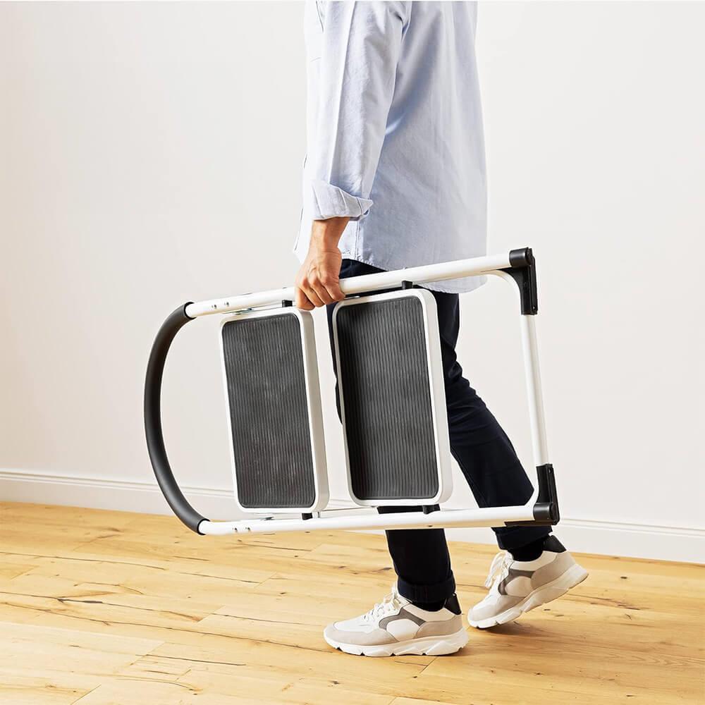 Díky kovové konstrukci jsou schůdky pevné, zatímco protiskluzové schody a gumové nožky poskytují vynikající stabilitu. Ergonomické madlo zajišťuje podporu při stoupaní a sestupování.