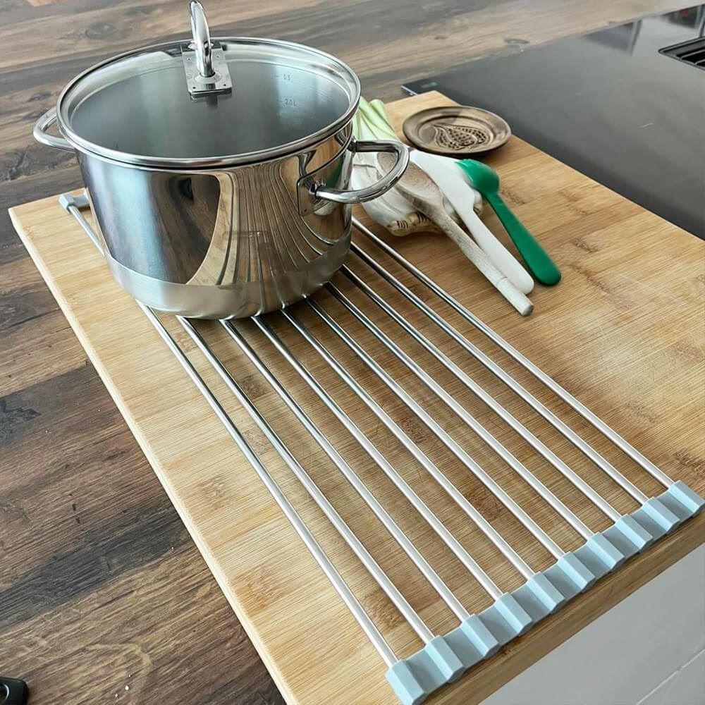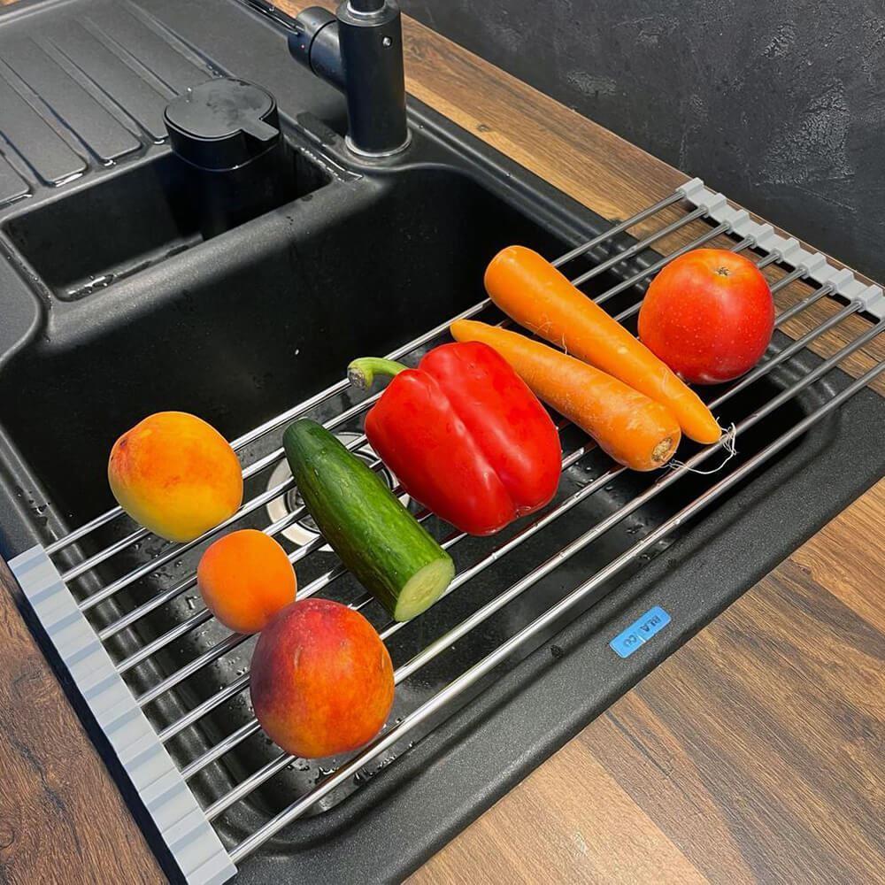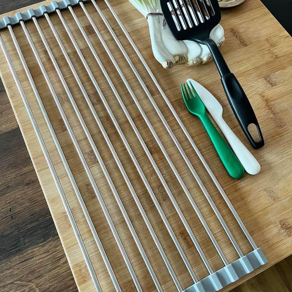 Skládací odkapávač na nádobí se stane nezbytností v kuchyni. Pokud máte v kuchyni málo místo bude tím pravým. Odkapávač snadno složíte a zase rozložíte. Pokud ho zrovna nebudete chtít mít na lince, složíte ho do ruličky a můžete ho umístit kamkoliv. Nezabere skoro žádné místo a budete ho mít tak při ruce. Odkapávač je velice stabilní. Výhoda tohoto odkapávače oproti klasickým plastovým odkapávačům je taková, že voda bude z nádobí stékat přímo do dřezu a nebude se nikde držet a třeba plesnivět. Odkapávač nemusíte ani nijak výrazně čistit, jelikož tam voda nikde nezůstává a nedrží se.Odkapávač se může používat dále na odkapávání zeleniny nebo ovoce. Ale také je možné ho využívat jako mřížku pod rozpálený hrnec nebo pánvičku.