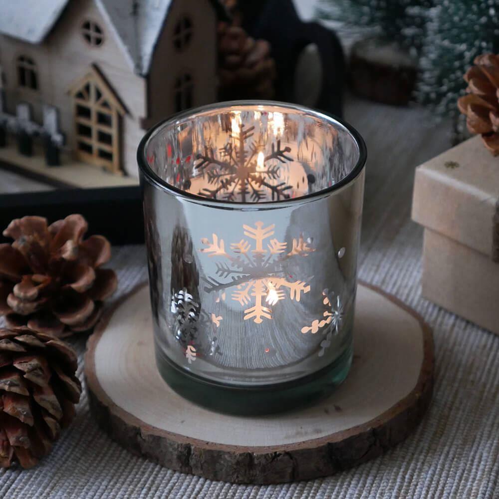 Skleněný vánoční svícen na čajovou svíčku - sněhové vločky