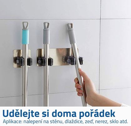 Při aplikaci nemusíte používat lepidla ani jiná nářadí. Držák je pevný a udrží vaše úklidové pomůcky, jako je mop, koště, či kuchyňské náčiní, jako jsou vařečky atp.