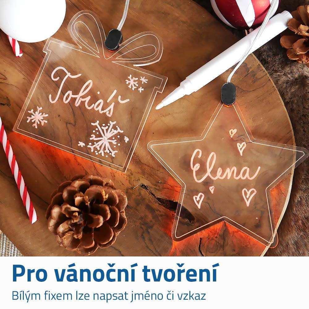 Svítící vánoční ozdoba, kterou si můžete sami dotvořit, přináší do vašeho domova kreativitu a zářivé světlo. Stačí přidat vlastní nápis nebo obrázek a ozdoba ožije ve vašem stylu! Díky svítícímu efektu budou vaše vánoční dekorace nepřehlédnutelné a váš stromeček získá jedinečný a osobitý vzhled. Na ozdobu lze napsat vzkaz či jméno bílým přiloženým fixem. Jména i vzkazy lze mazat a můžete vymýšlet další a další motivy. Tato ozdoba je tak ideální pro rodinné dekorování stromečku nebo jako krásný dárek s věnováním pro vaše blízké. Vykouzlete si kouzelnou vánoční atmosféru s originální ozdobou!