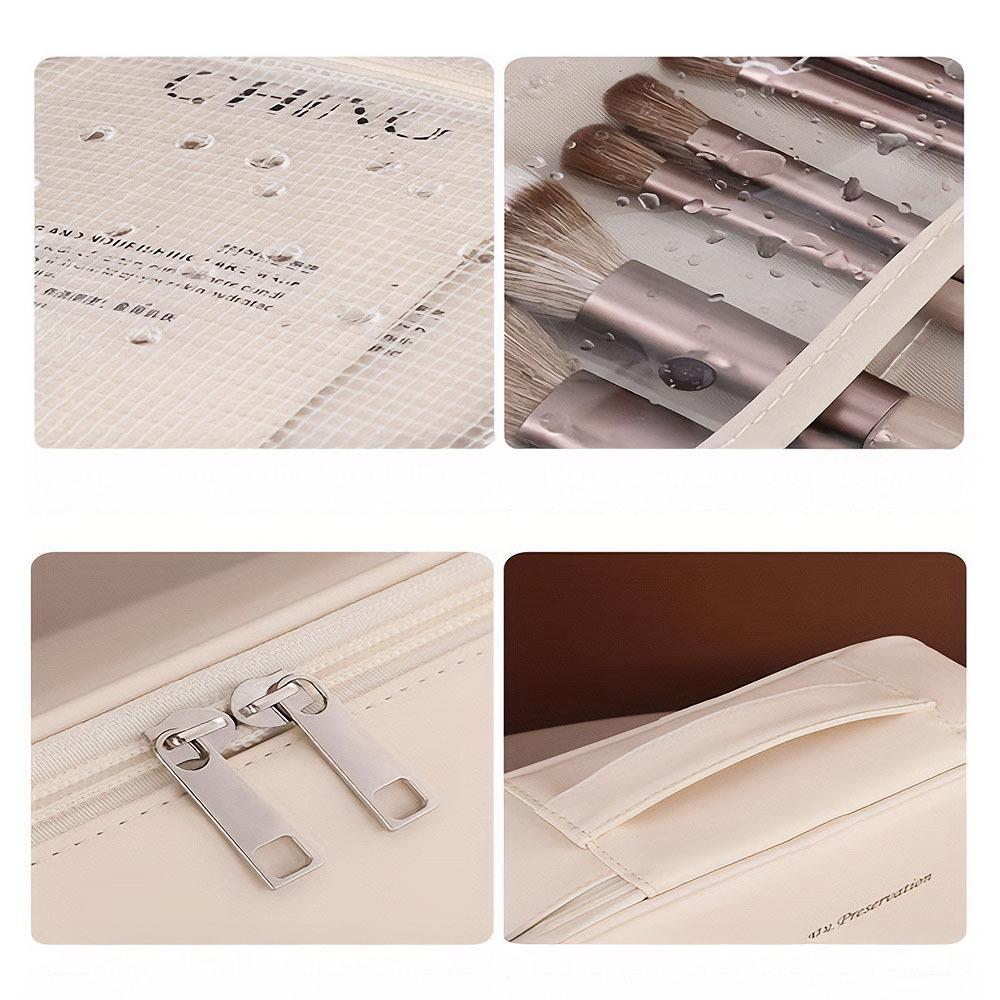 Prostorná kosmetická taštička s průhlednými prvky a promyšleným členěním pro maximální přehled. Ideální na cesty i každodenní použití. Odolná, stylová a praktická.